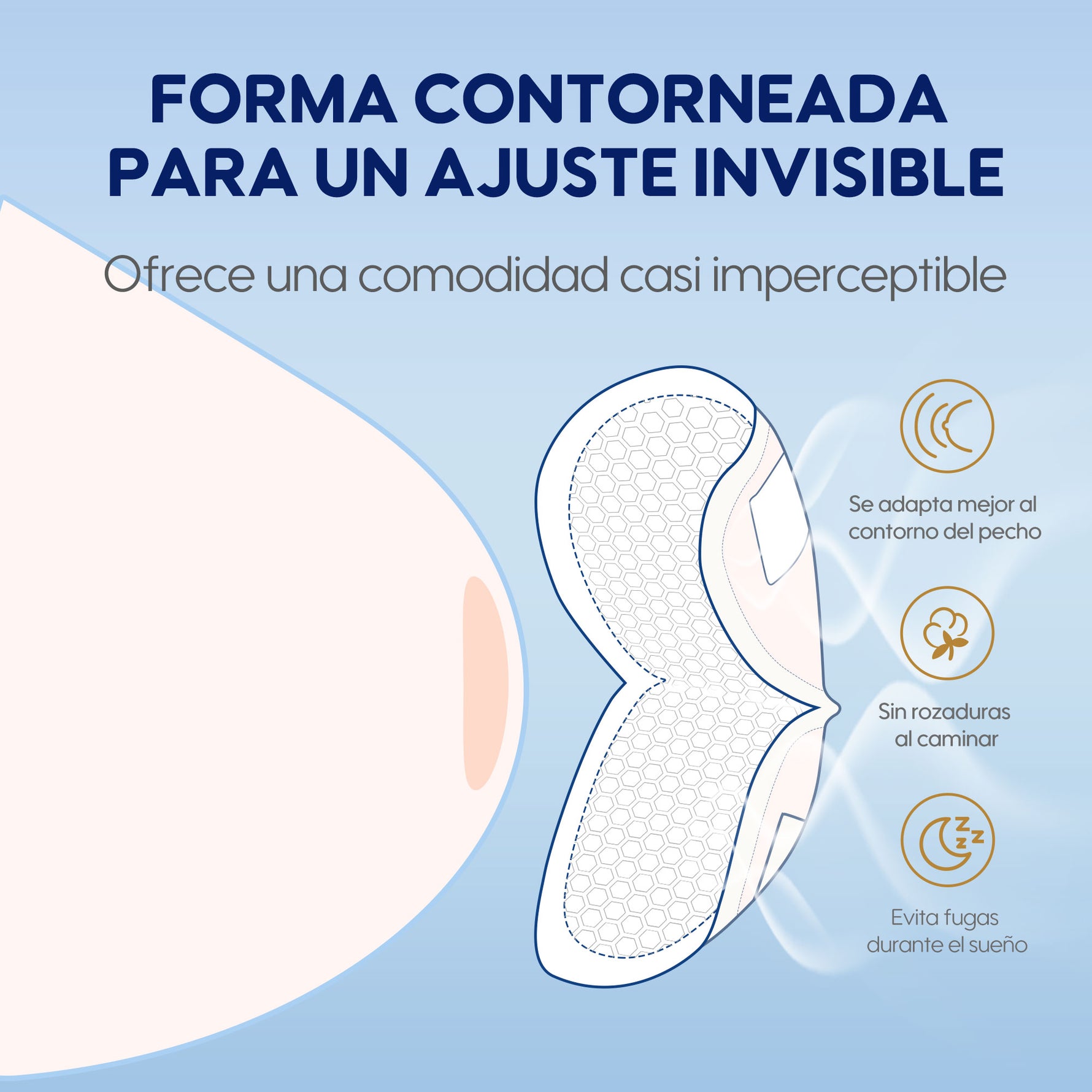 Diseñada para un ajuste discreto que se adapta perfectamente al pecho, evitando rozaduras y fugas.