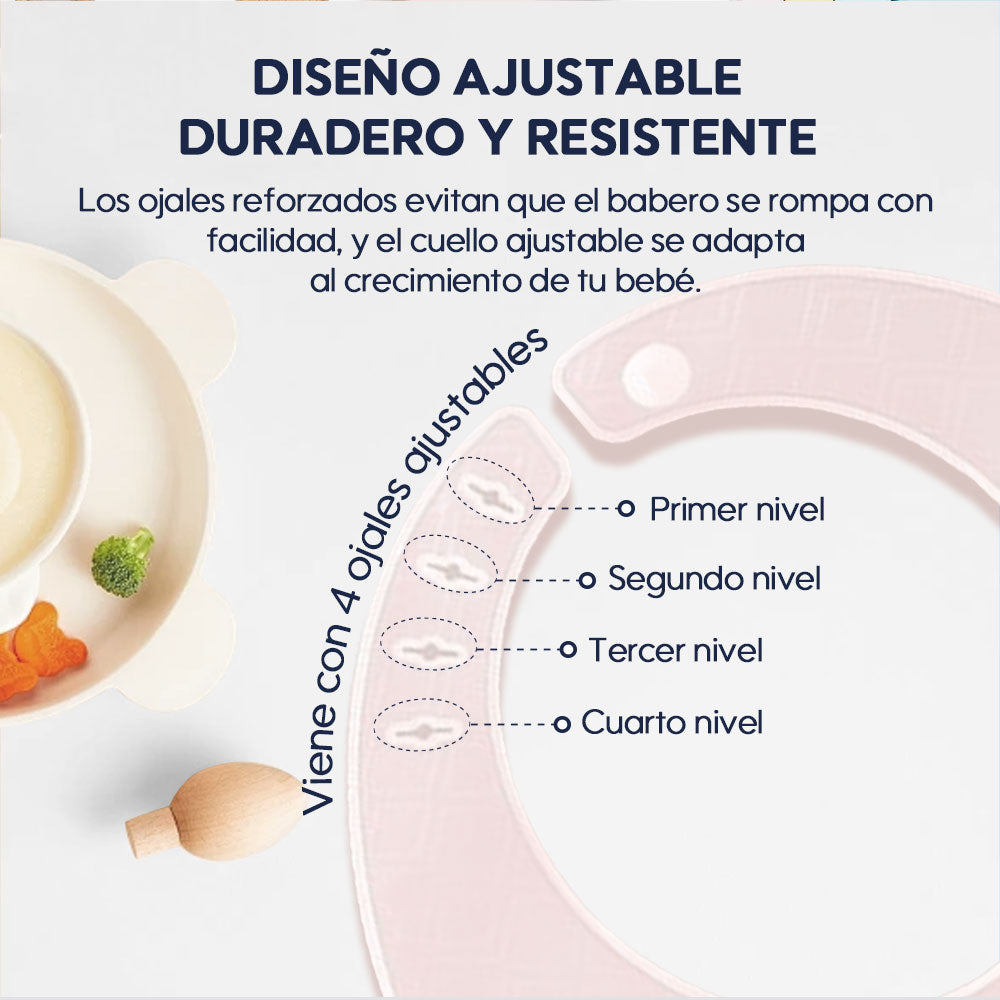 4 ajustes de la banda del cuello (de la 1.ª a la 4.ª posición), lo que permite que el babero crezca con su hijo para un ajuste perfecto.
