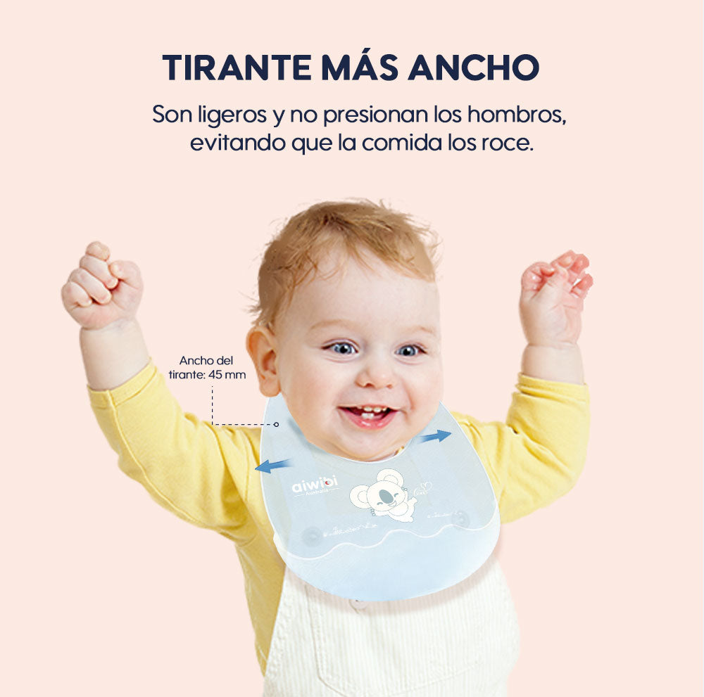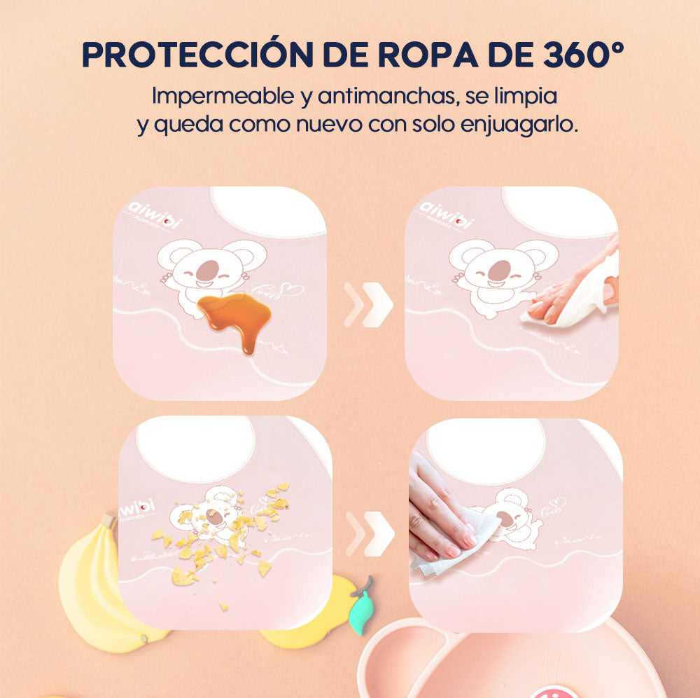 ¡Limpiarlo es muy fácil! El babero tiene un diseño que no deja marcas y evita que se adhieran las manchas, así que puedes limpiarlo con un paño o enjuagarlo con agua. Además, es apto para lavavajillas para mayor comodidad.